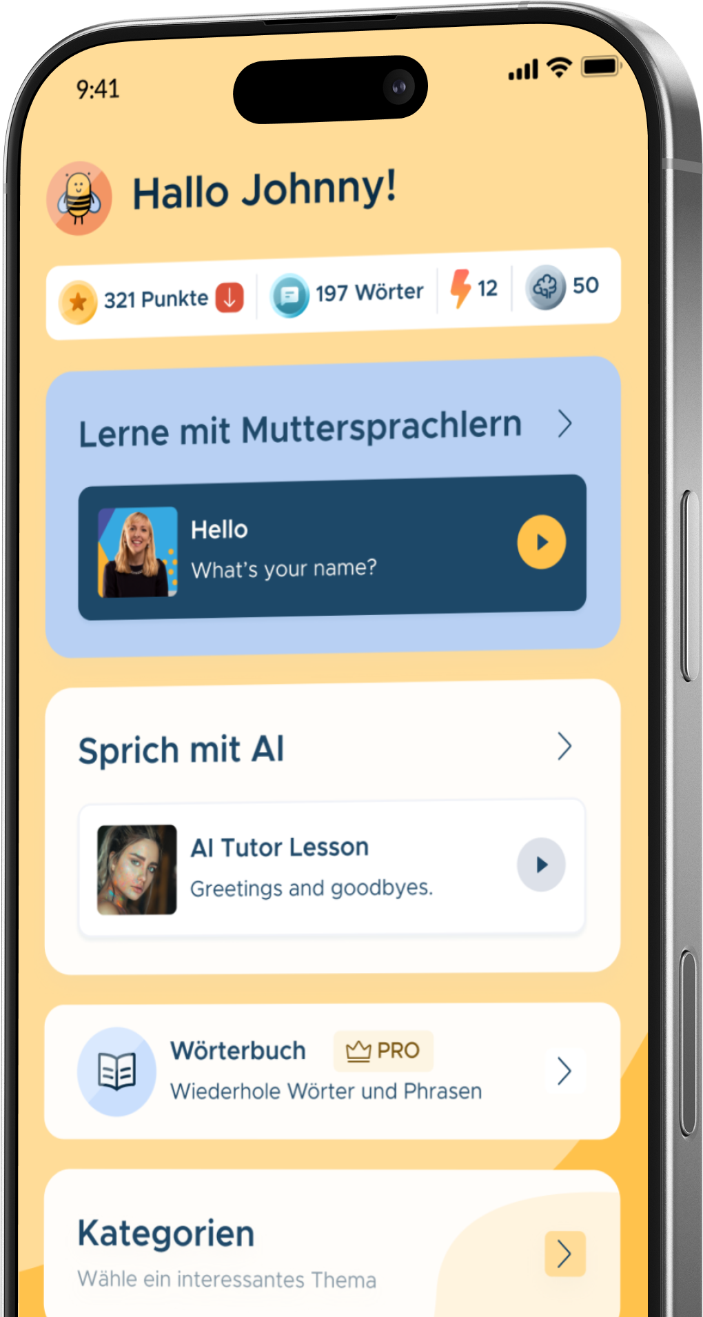 Wir fokussieren uns auf einer natürlichen Lernmethode – das bedeutet Sprechen vom ersten Tag an. Die meisten Lernenden haben Schwierigkeiten mit flüssigem Sprechen, aber mit BeeSpeaker wirst du von der allerersten Lektion auf viel sprechen.