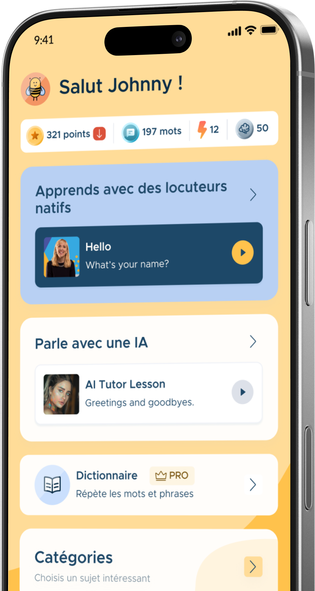 Répète des mots et des phrases ou réponds au professeur – l’application écoute, analyse ta prononciation et te donne un feedback instantané pour t’aider à t’améliorer.